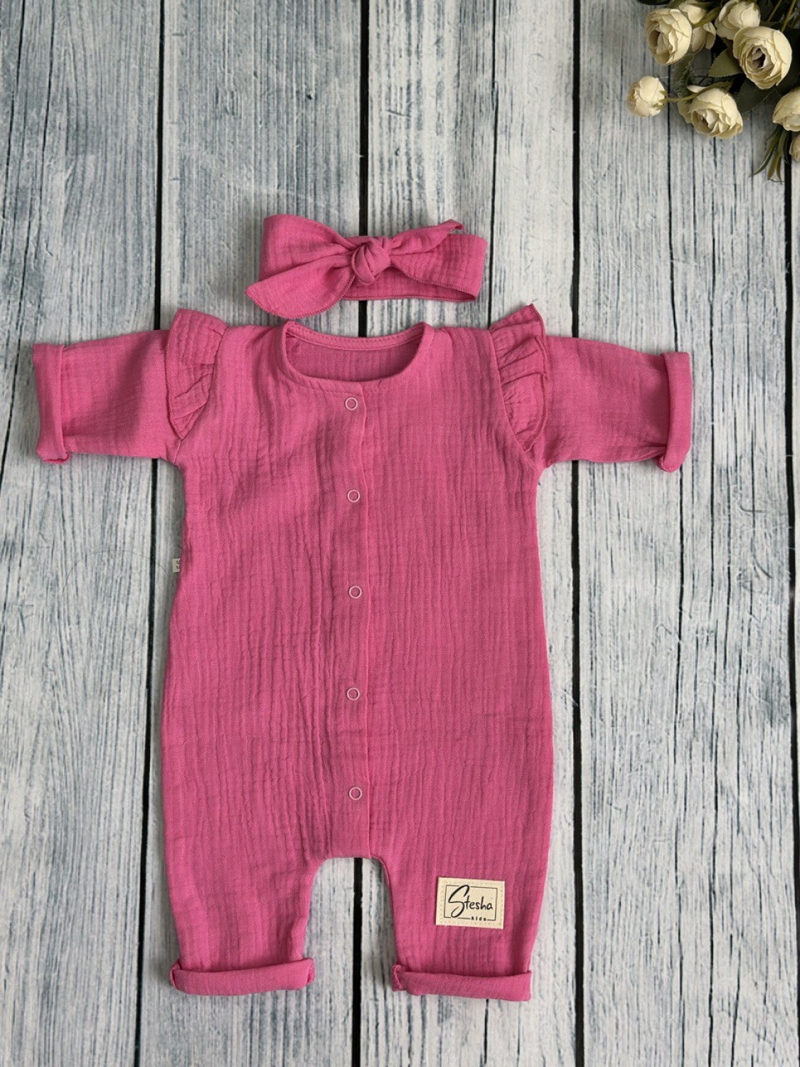 Теги: Купить оптом детский комбинезон . 336-Ф. Комбинезон с повязкой для девочки из муслина, хлопок 100%, размеры 56,62,68, фуксия цена,отзывы официальный сайт "Стеша Новочеркасск"